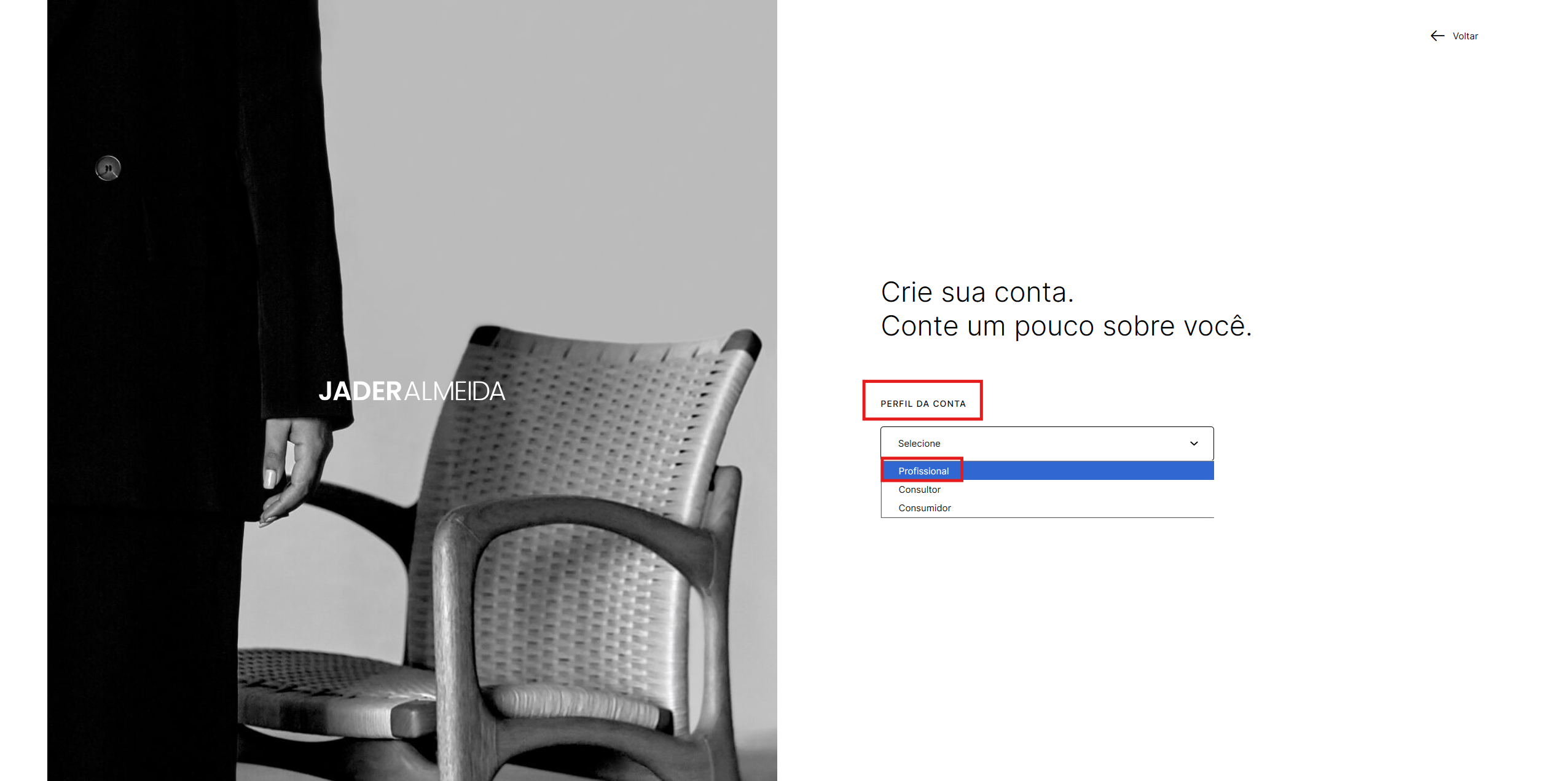 Preencha as informações solicitadas e escolha o perfil Profissional.