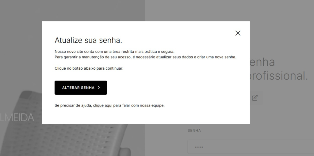 Se você já acessava a área restrita da versão anterior do site, não é necessário criar uma nova conta. Basta digitar seu e-mail na área de login e inserir sua senha. Em seguida, aparecerá um aviso solicitando a alteração da senha.