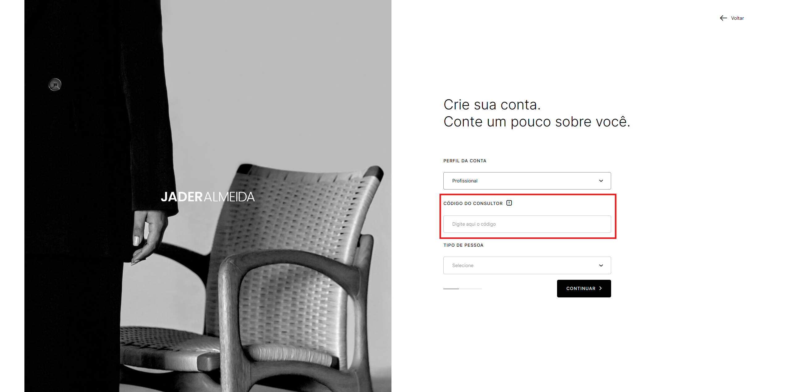 Solicite ao consultor o código de acesso para concluir o cadastro.